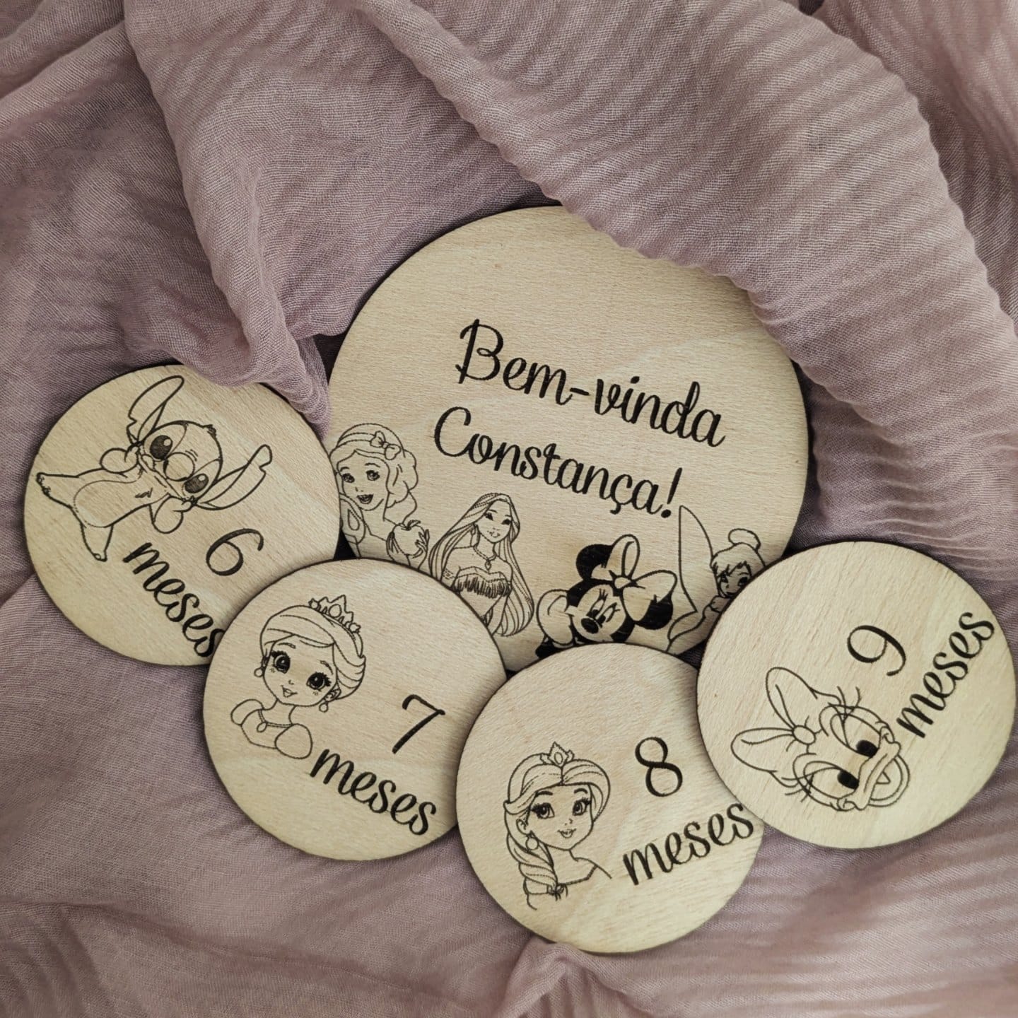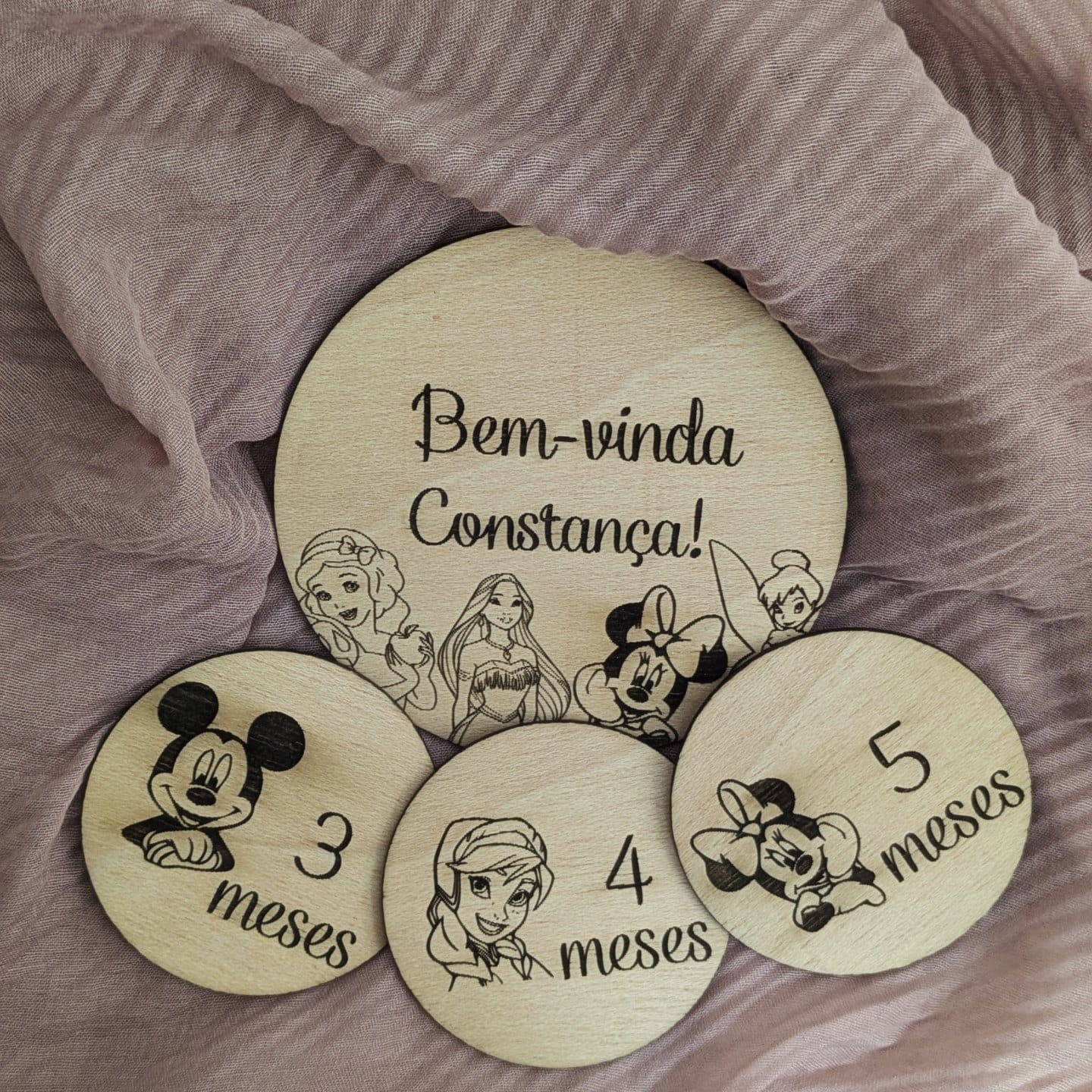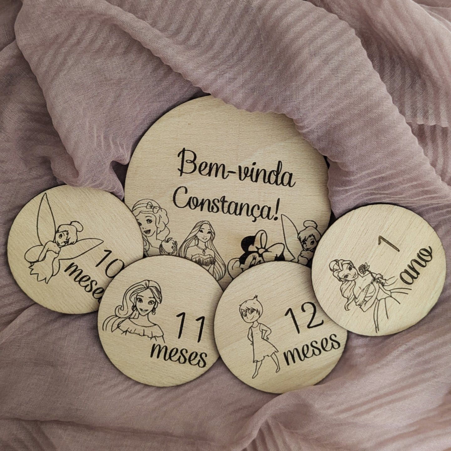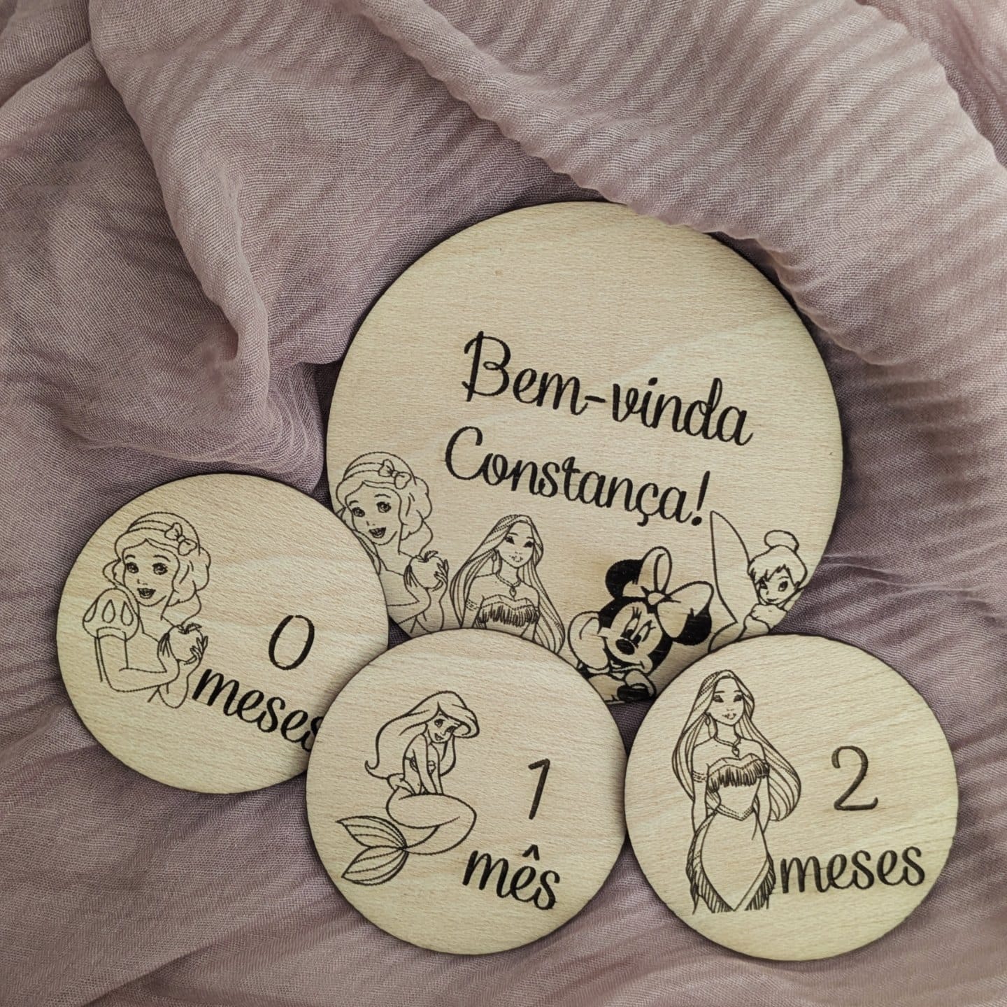 Milestones com princesas e placa de Bem-vindo(a) personalizado